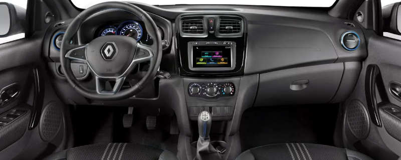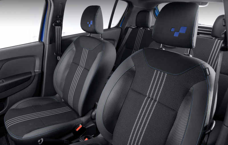 O interior conta com volante revestido em “couro” e bancos exclusivos (esses últimos opcionais no 1.0), com nova padronagem de tecido e bordado com a identidade visual da Renault Sport nos apoios de cabeça. O painel de instrumento e as saídas de ar trazem detalhes na cor azul.